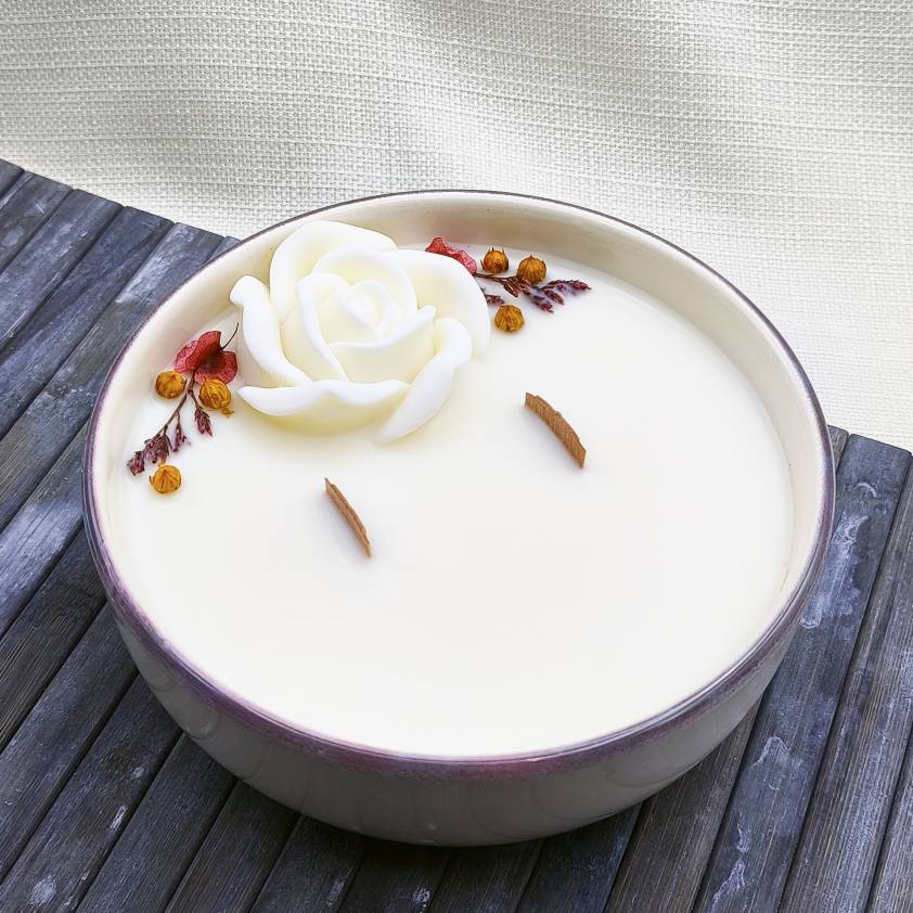 combinación de cera de parafina de muy buena calidad, flor preservada y cariño que aporta calidez, fragancia y decoración a cualquier estancia de tu hogar.