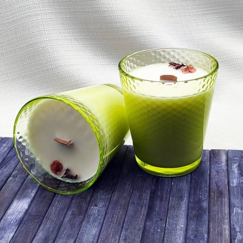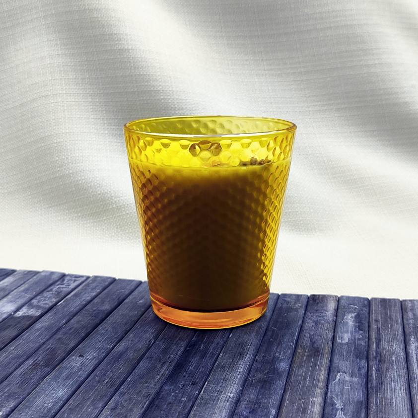 La cera es de color blanco y el recipiente es un baso de cristal amarillo en relieve.
