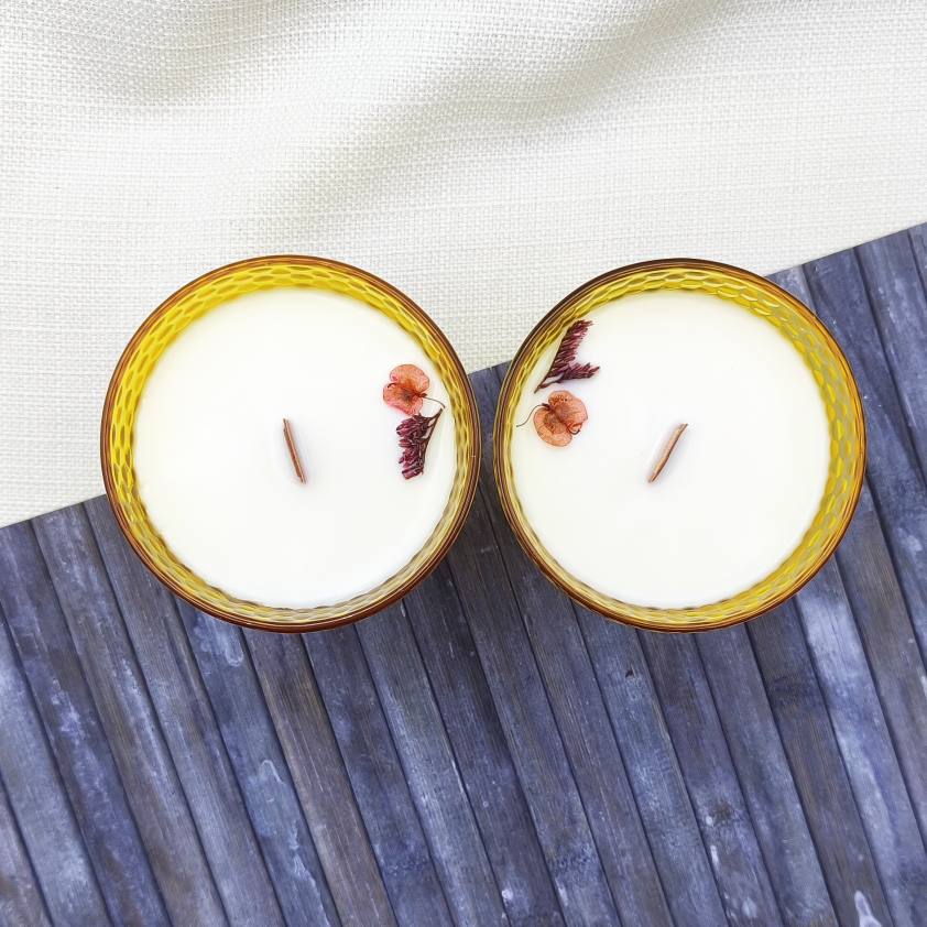 250 gramos de cera vegetal de soja con aroma a Ámbar y 1 mecha de madera plana doble. Con un vaso de cristal amarillo en relieve la vela de cera de soja Oriental está decorada con la flor preservada de Dudinea y Limonium.
