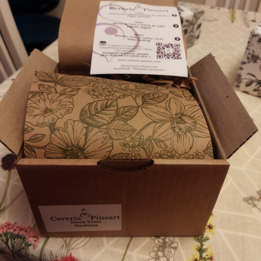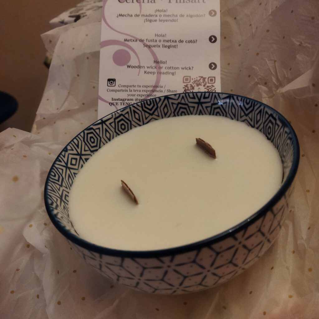 Esta vela aromática, Gardenia Town, es muy bonita también; la cerámica recuerda a la de Sargadelos, de Galicia, por eso la elegí. Gran valor añadido al envío, con su envoltorio magnífico y bien presentado con detalles de lazos. Todo muy artesanal y con gusto.