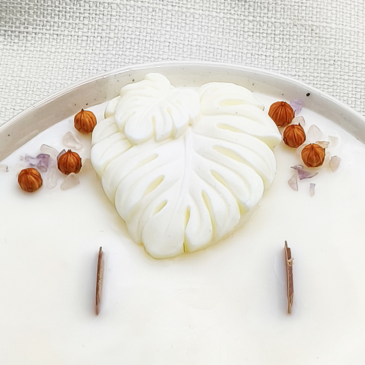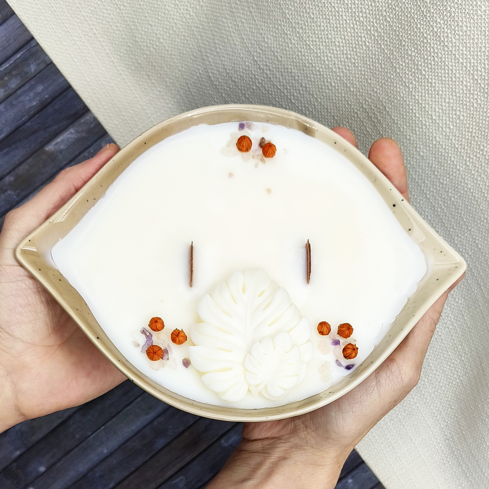 Las velas aromáticas están hechas a partir de cera de soja, de origen 100% vegetal, cuya textura cremosa ofrece la posibilidad de adaptarse a todo tipo de soportes y recipientes.