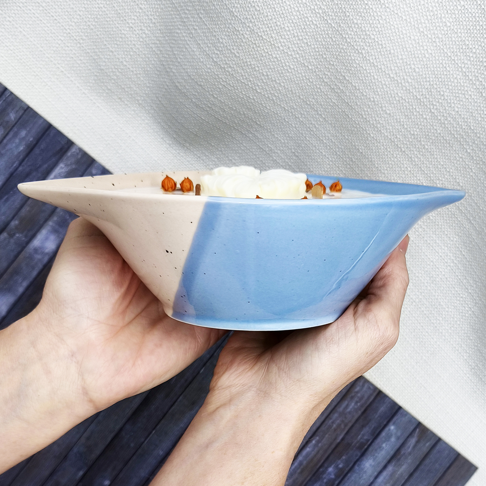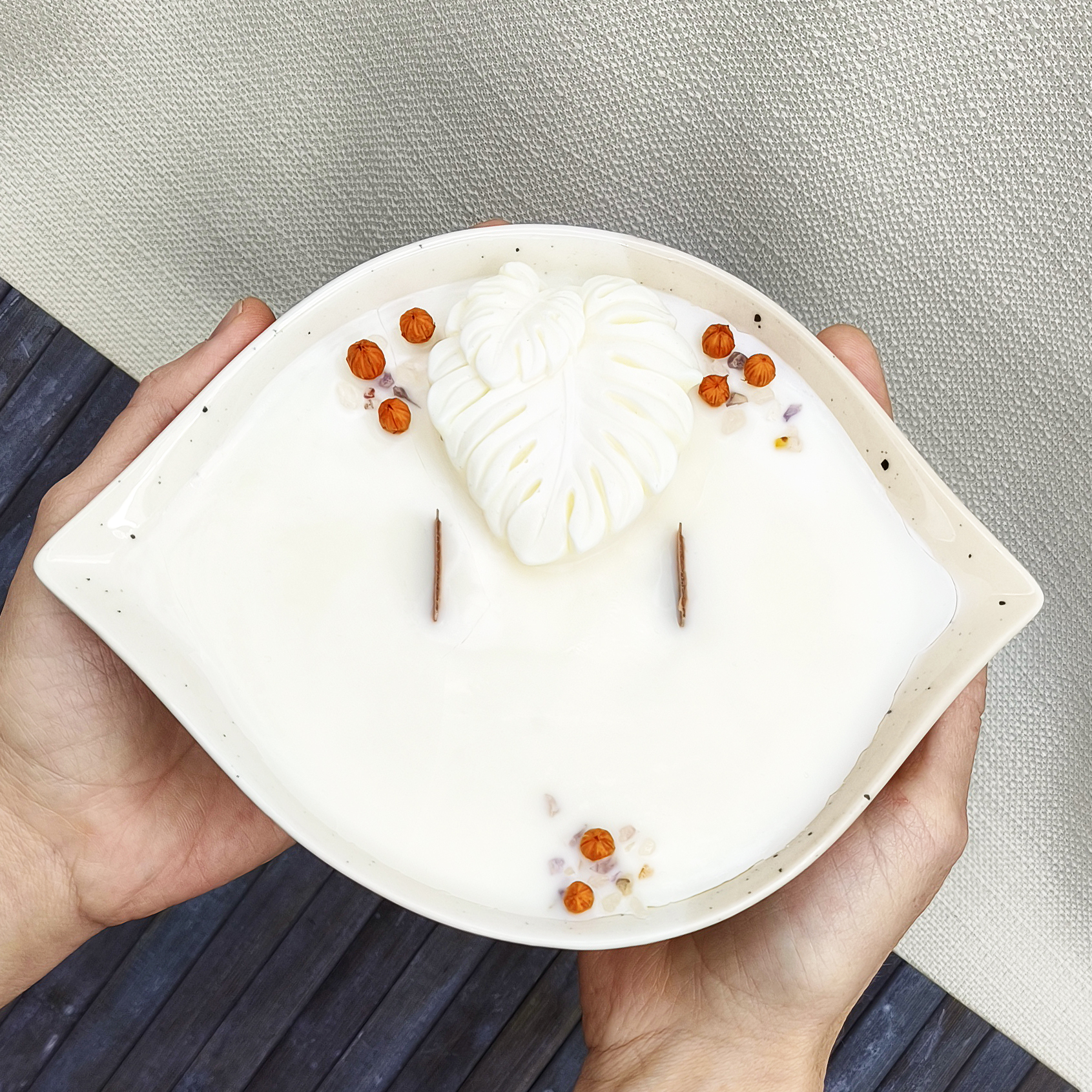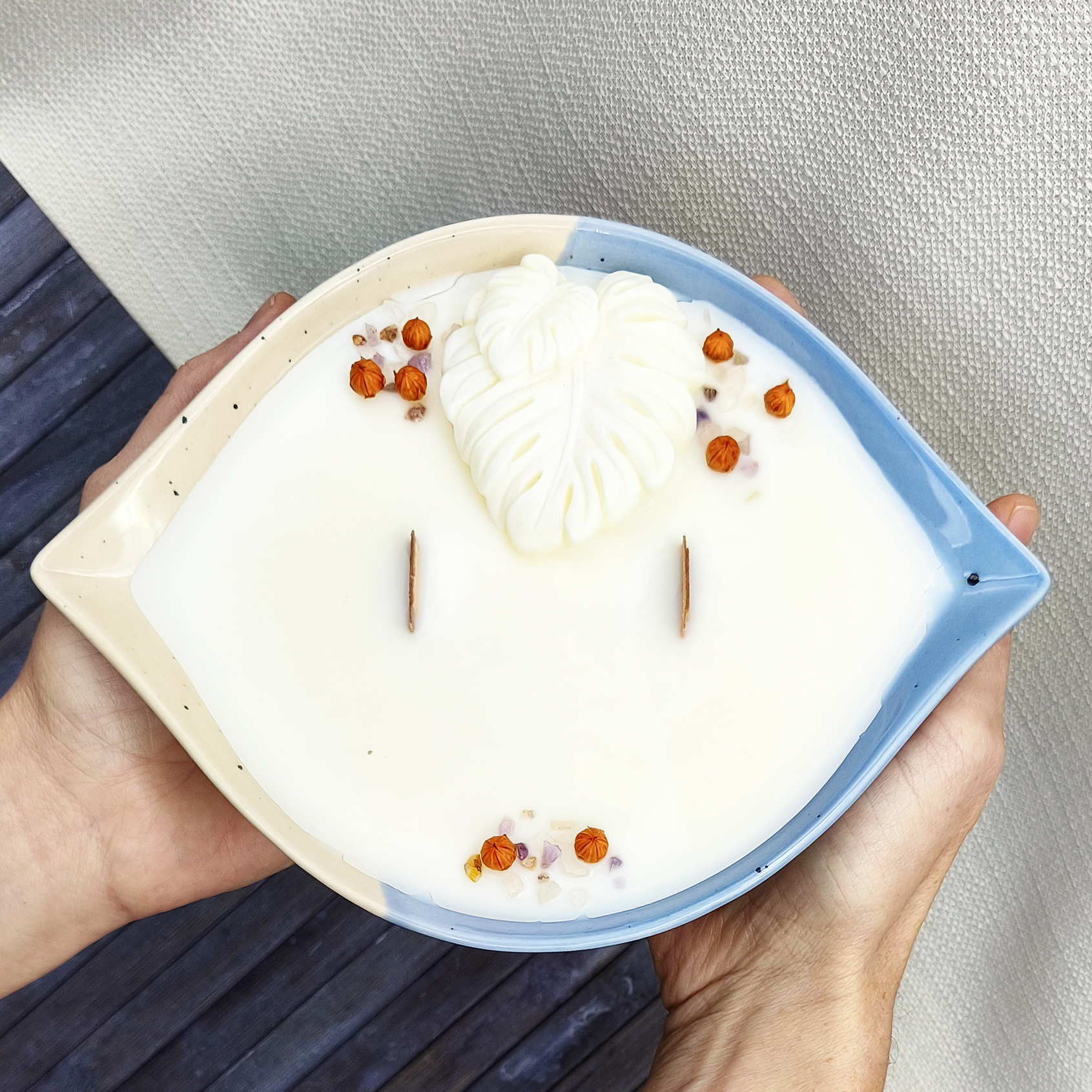 La cera es de color blanco y el recipiente es un bol de cerámica con forma de hoja. La vela Maui la puedes escoger en tres colores diferentes, de color blanco con azul, blanco con blanco crema o blanco con marrón.