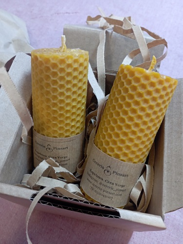 El proceso de elaboración de las velas de cera de abeja es artesanal, enrollando las planchas de cera de abeja virgen y permitiendo un prendido más efectivo y duradero. El resultado es una bonita combinación entre el color y la característica textura de panal de abeja de la cera.
