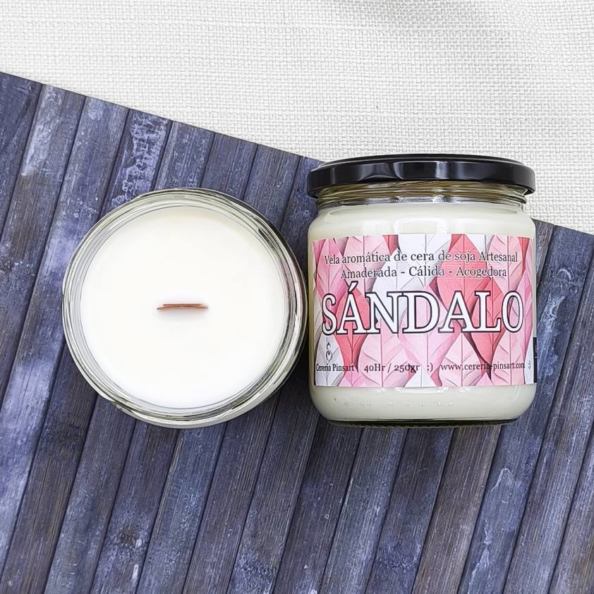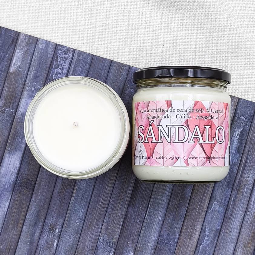 Esta vela aromática de cera de soja con esencia de Sándalo está realizada con cera vegetal de soja, esto hace que su textura sea cremosa. Hecha a mano una a una con mucho mimo y dedicación.